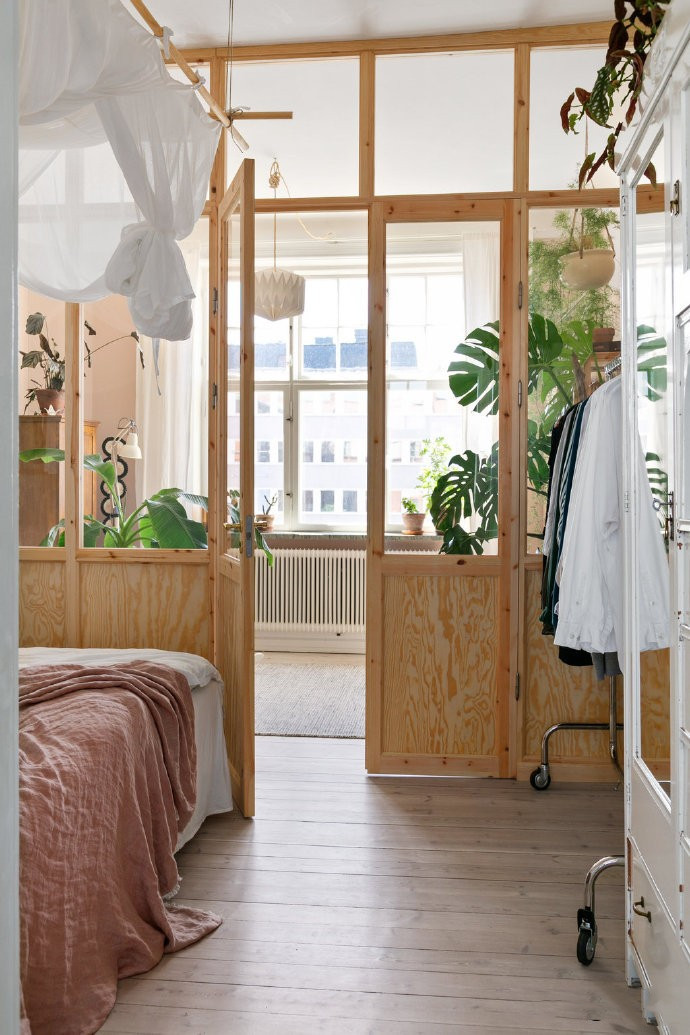而卧室则是用实木的玻璃门做隔断设计,这样既符合北欧风的装饰,也让更多的光线可以照射到卧室内,使得室内的采光更好,通风更好。