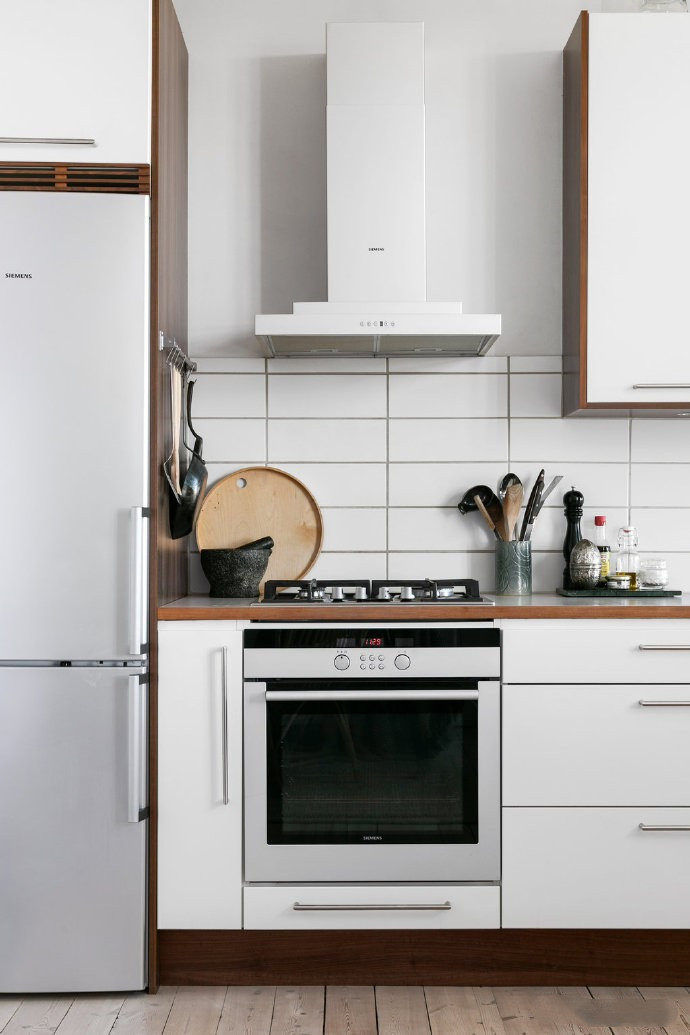 厨房做了定制的橱柜设计,白色的门板和仿木纹的石板做的橱柜装饰,和整个北欧风的风格装饰非常搭,厨房的防溅挡板用的是小面积的瓷砖做装饰,整体白色为主色调的搭配很是时尚,北欧风氛围满满。