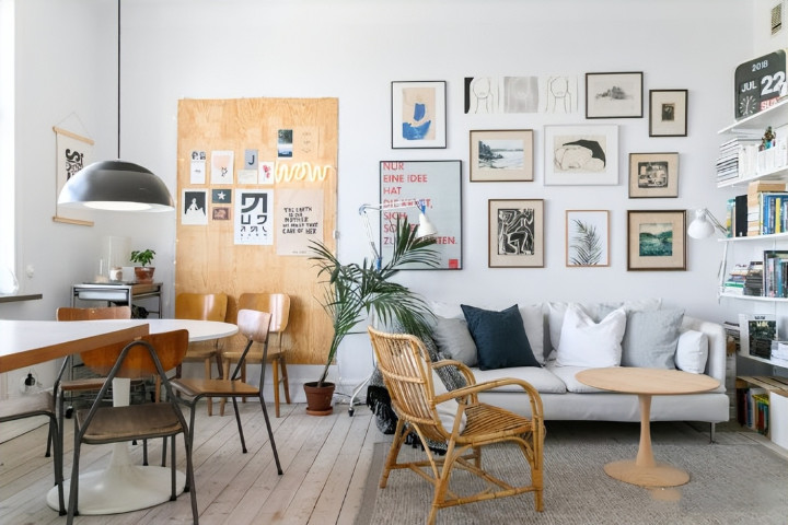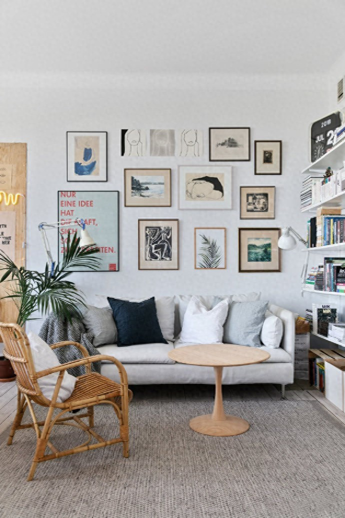 入户一进来最先看到的就是客厅,客厅本身的空间不大,小小的客厅摆放下了一张两人沙发,利用墙面的空间做了定制柜子的装饰,满满的书籍摆放上来更显得“书香世家”的感觉,沙发背景挂满了装饰画,整体的装饰搭配好看极了,实木的茶几以及藤椅,北欧风的氛围满满。